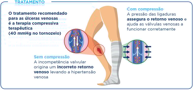 O objetivo é controlar a circulação, estimular a regeneração da pele e reduzir o risco de recorrência da ferida.